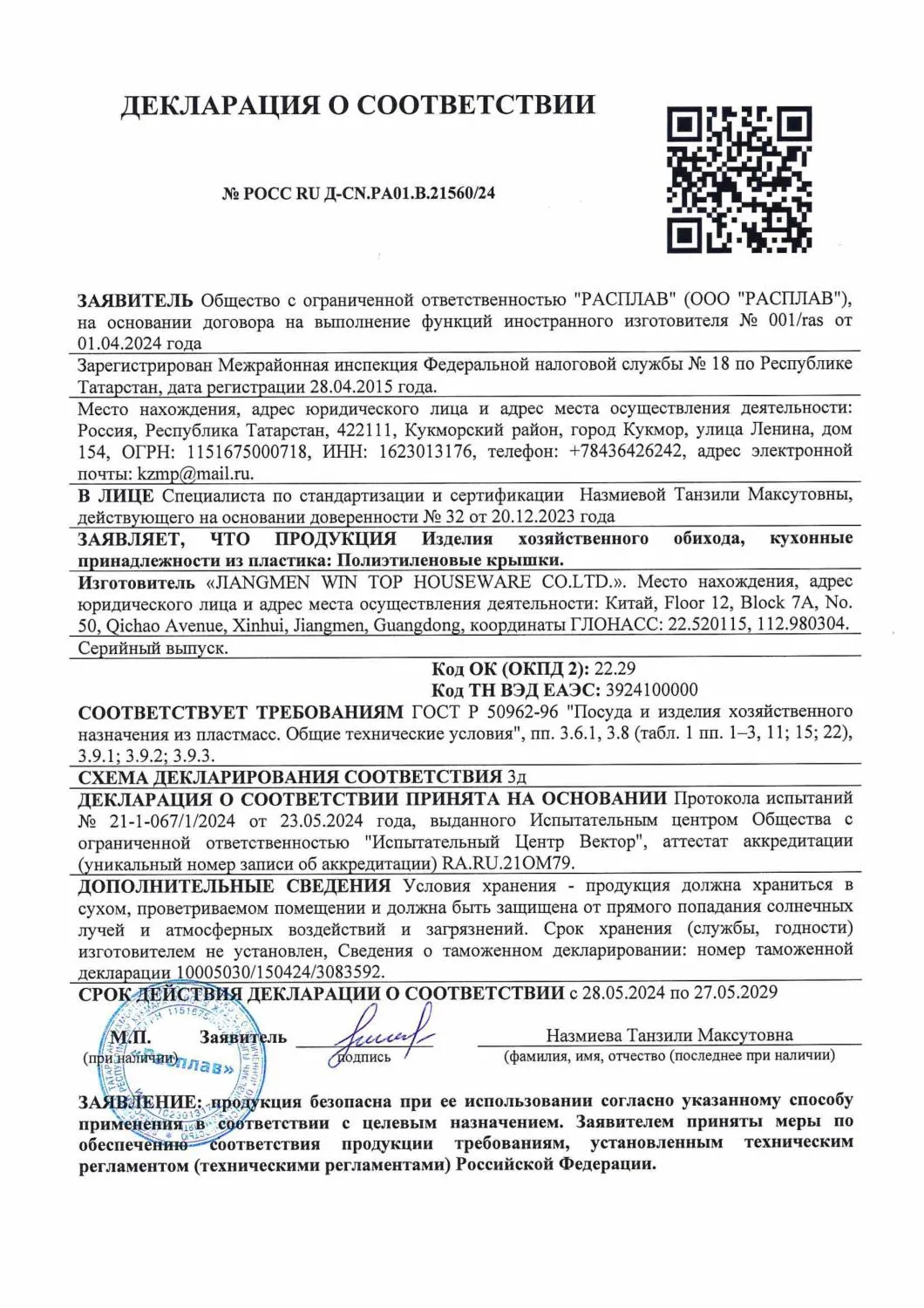 Декларация на посуду из нержавеющей стали ООО Расплав